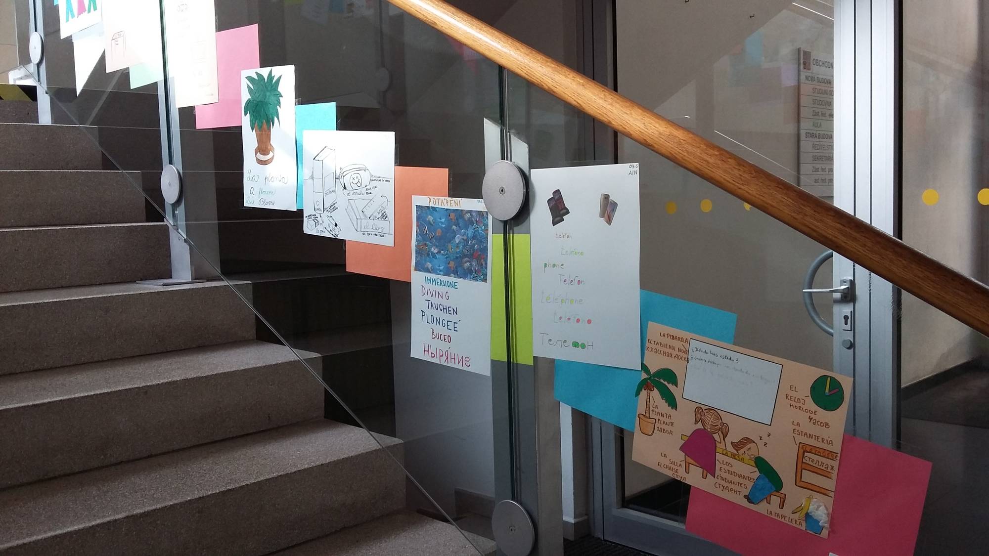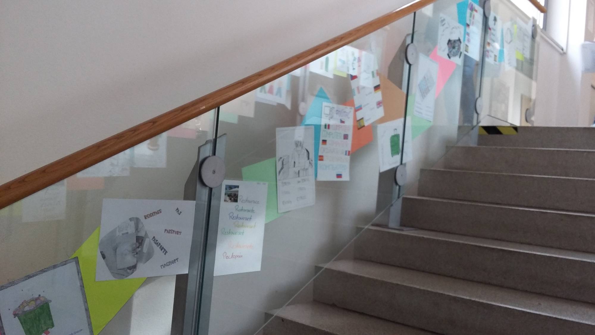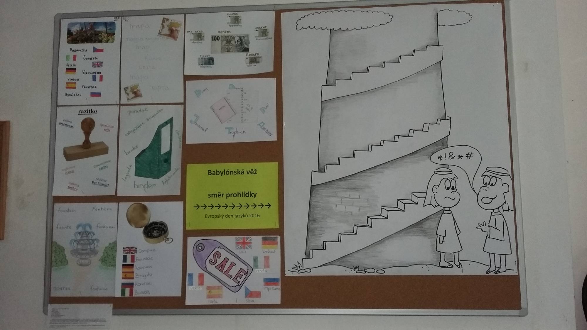 26.9.2016 naše škola oslavila Evropský den jazyků výstupem na pomyslnou Babylonskou věž. Schody věže (z přízemí do nejvyššího patra nové budovy školy) vyzdobili studenti kresbami, které představují stránky vícejazyčného obrázkového slovníku.
