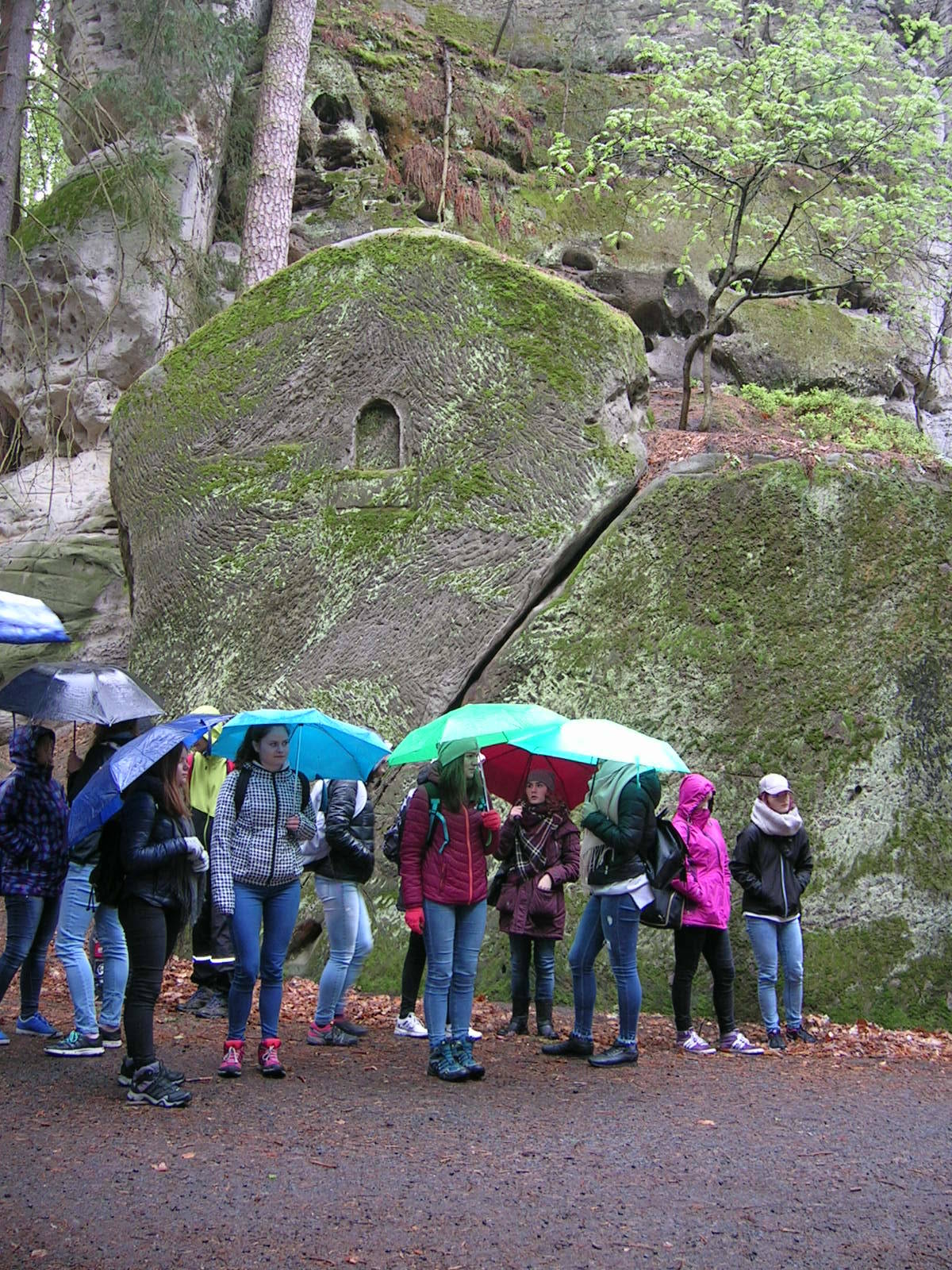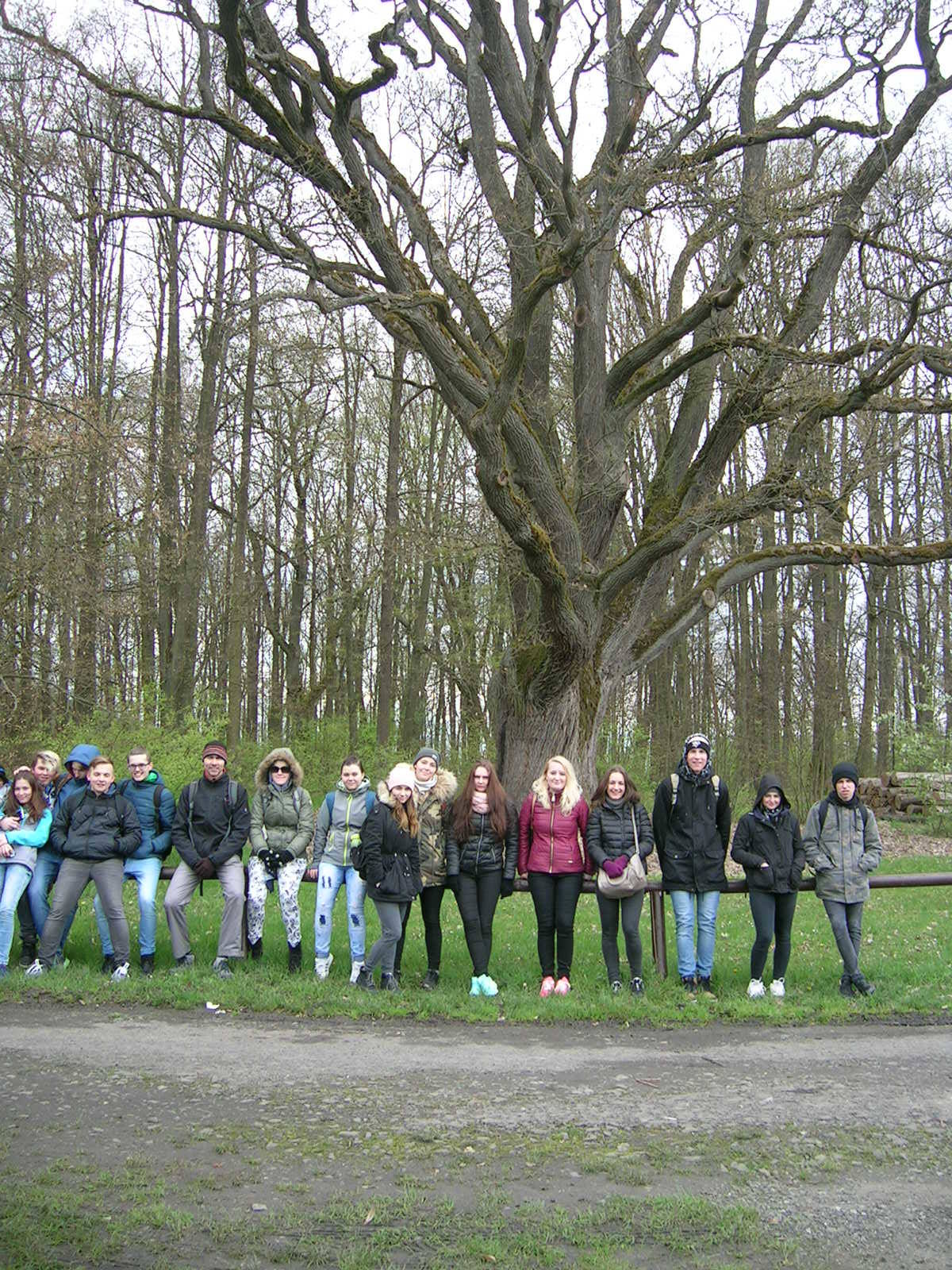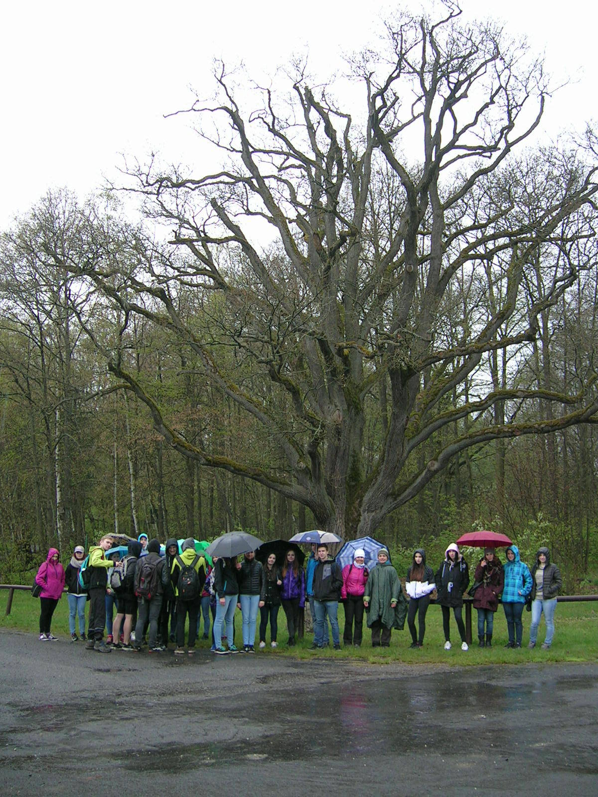 O týden později, ve středu 26. dubna bylo deštivé počasí, které nás donutilo zkrátit vyhlídkový okruh. Tentokrát nás prováděla naše bývalá kolegyně Maruška Bémová. I přes nepřízeň počasí žáci absolvovali významnou část naučné stezky. Obě exkurze jsme již tradičně zakončili u nejstaršího dubu Českého ráje, který se nachází v kempu Sedmihorky.
