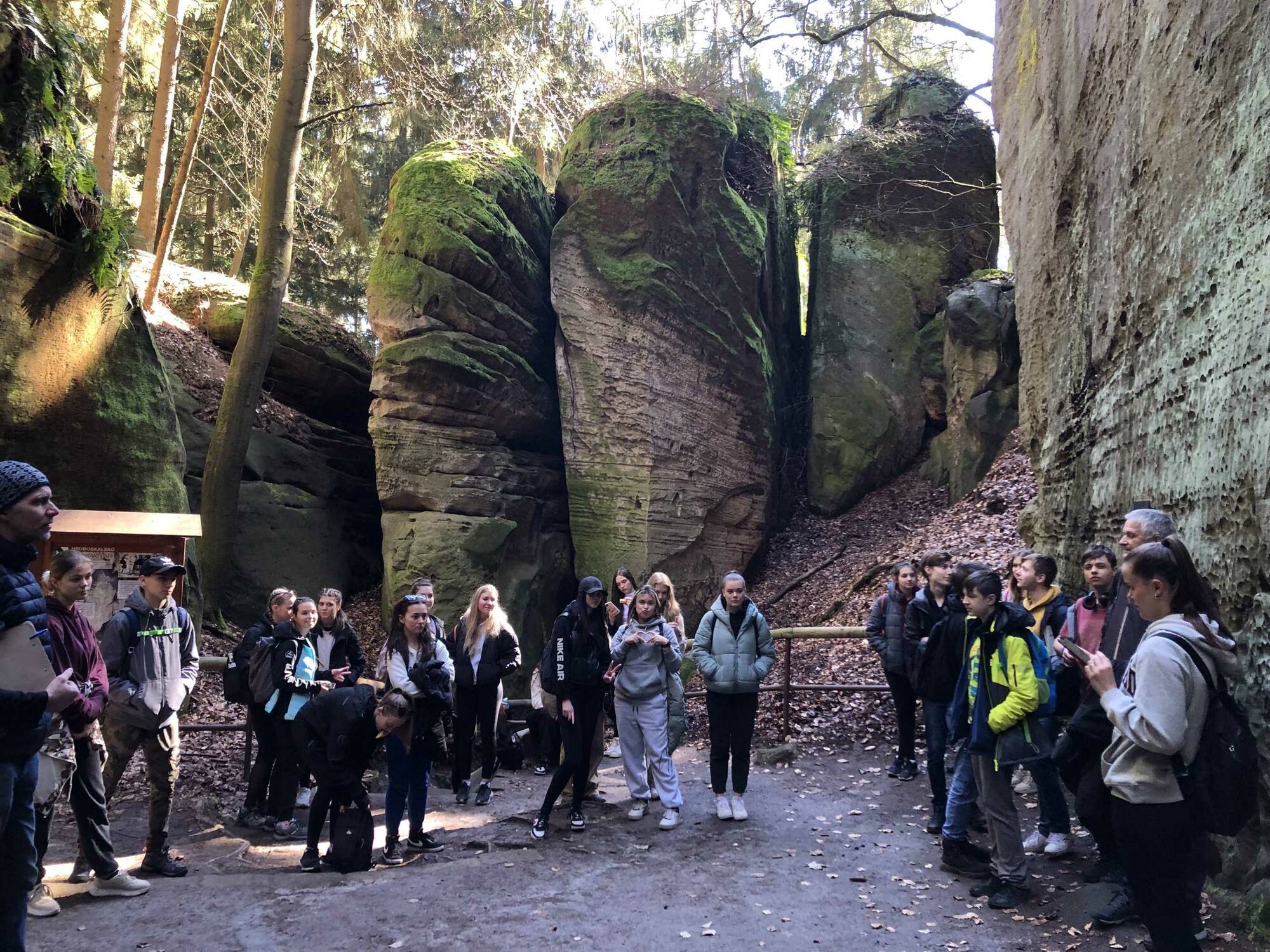 Další zastávka byla v zámecké rokli zámku Hrubá Skála. Toto místo je známé pro úzké průrvy ve skalách, kterými jen tak někdo neprojde. My však prošli všichni, a mohli jsme tak navštívit jedno ze zdejších ikonických míst Adamovo lože.