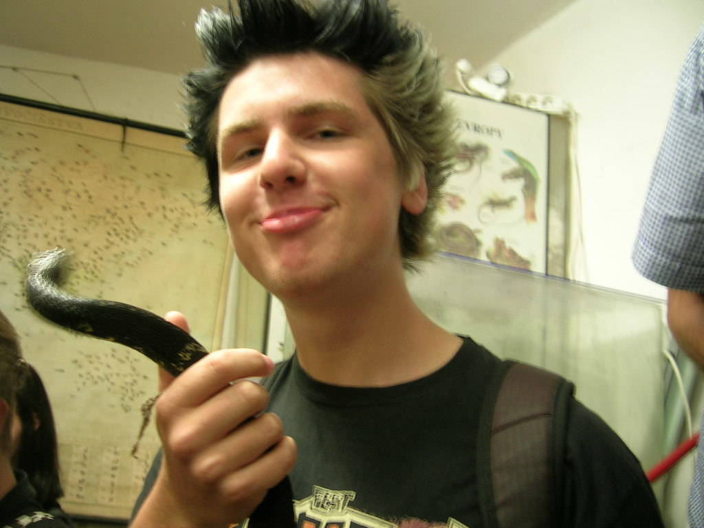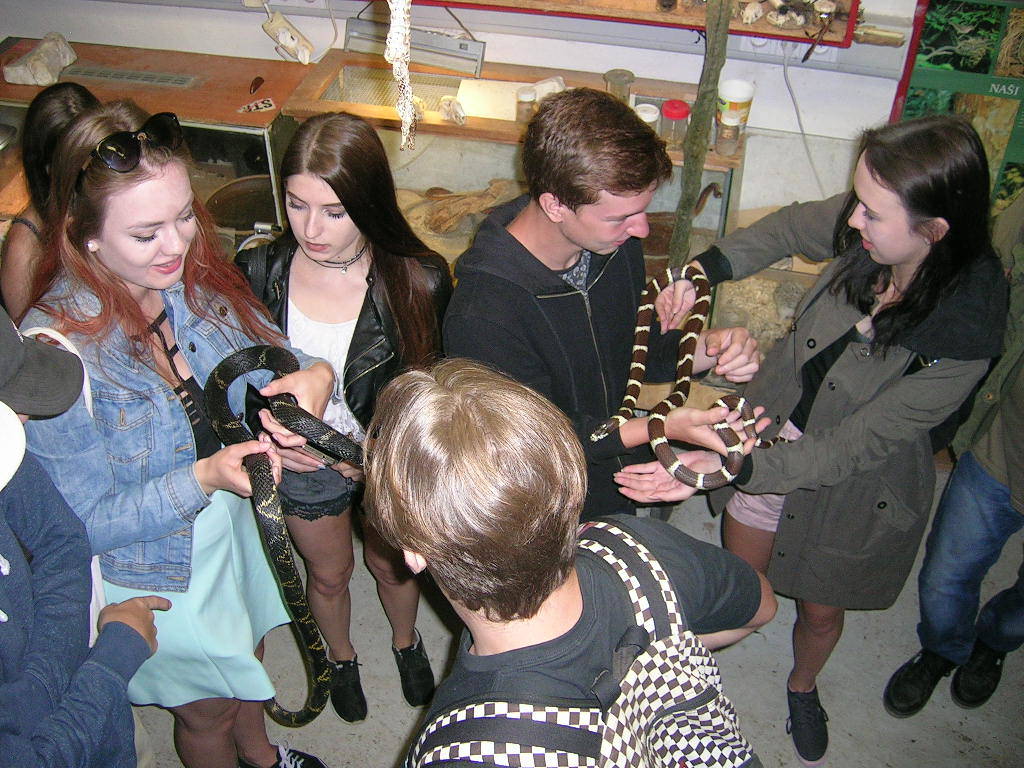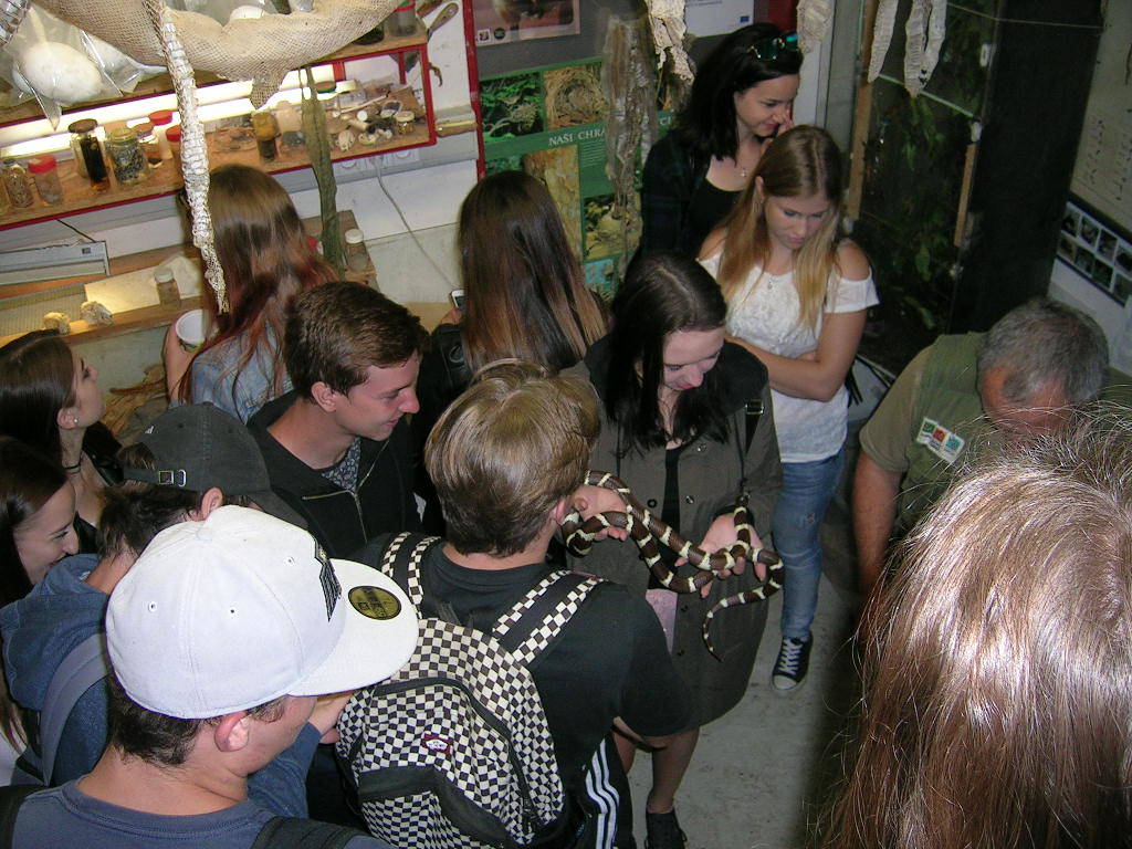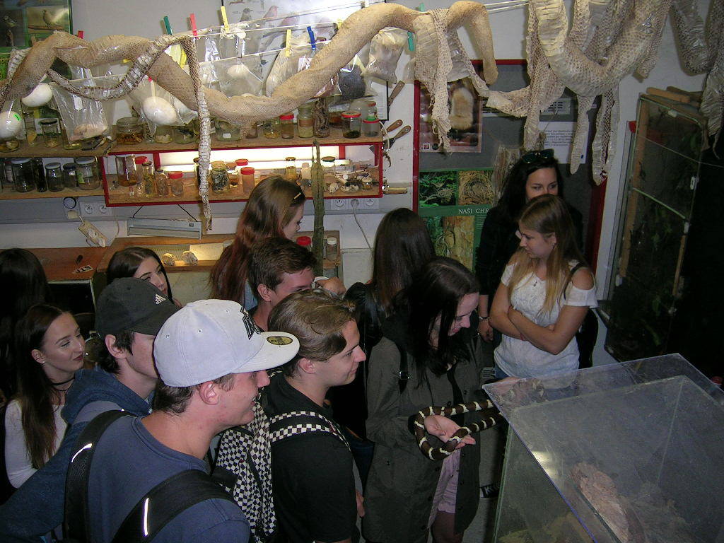 Náš průvodce Ing. Havle nás zavedl také do zázemí ZOO, kde se běžný návštěvník nedostane. Navštívili jsme přípravnu krmiv a pak především badatelnu, která byla plná terárií s hady, strašilkami či šváby. Kdo se nebál, měl možnost si na většinu zdejších „obyvatel“ sáhnout.