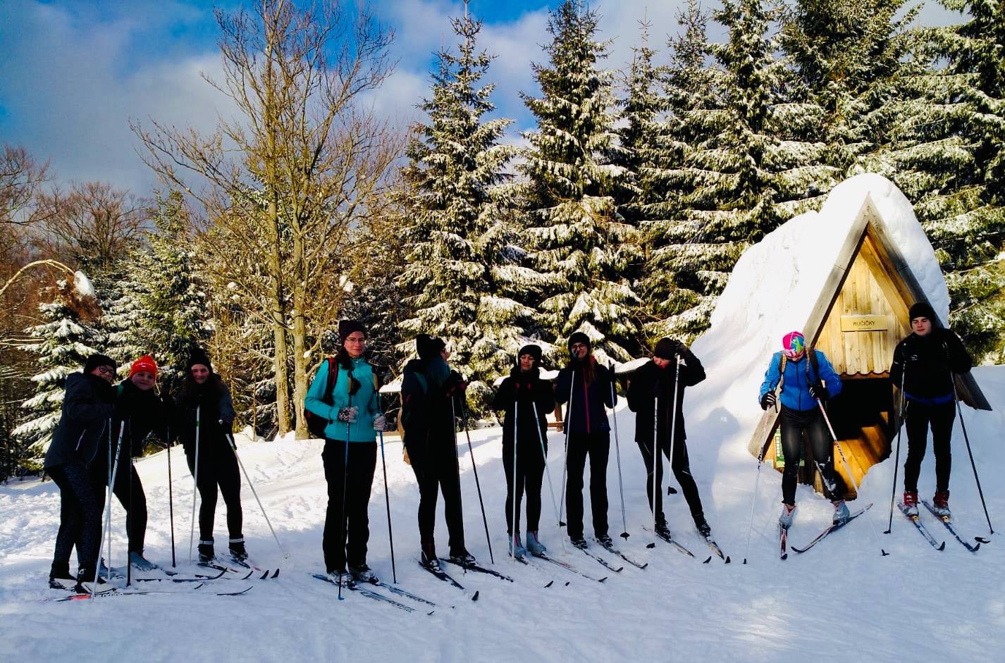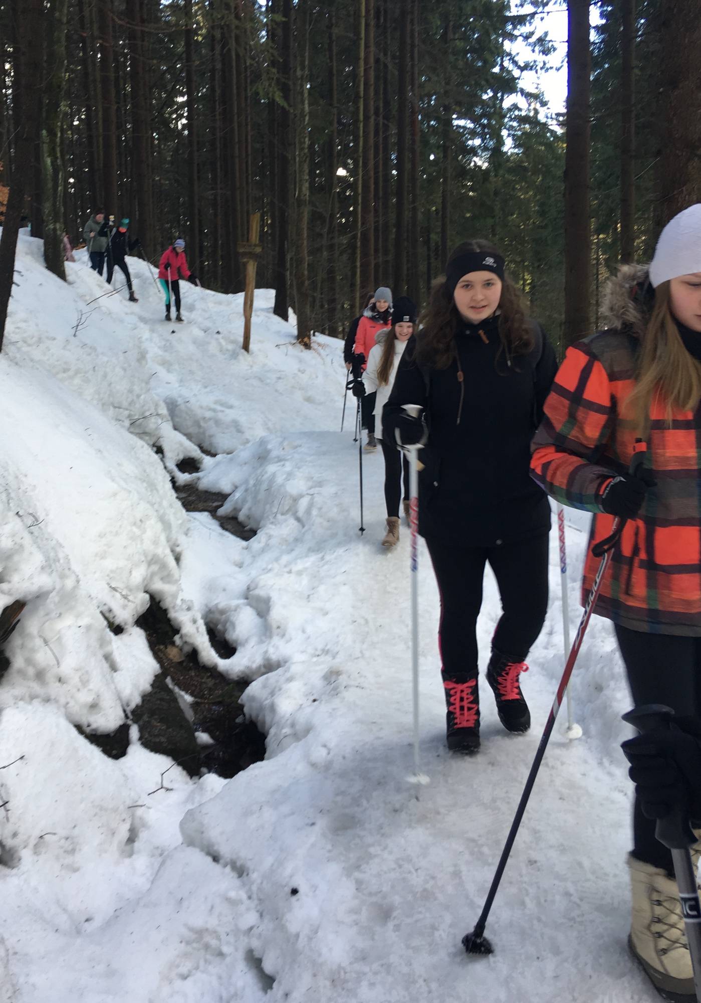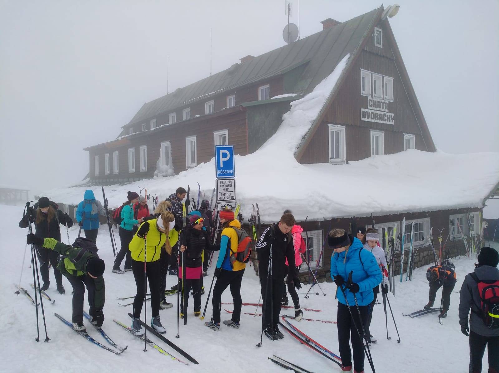 Ve čtvrtek jsme všichni vyrazili na běžky. Rozděleni jsme byli podle zdatnosti do dvou skupin. Ti zdatnější vyrazili na Dvoračky a ti, co s běžkováním úplně nekamarádí, se s ním seznamovali a pilovali své dovednosti.