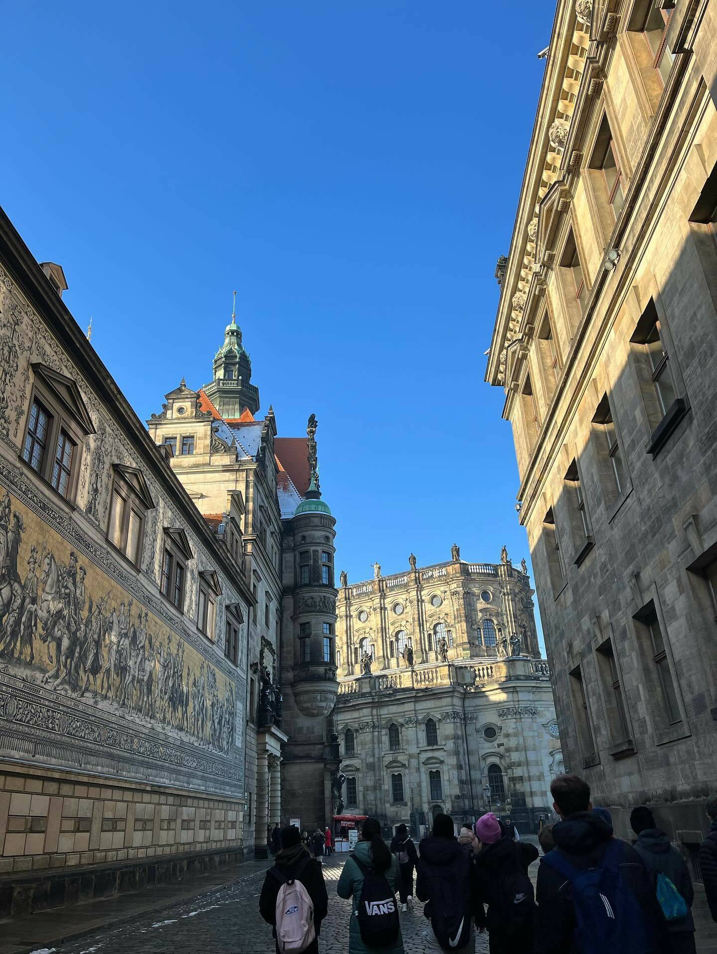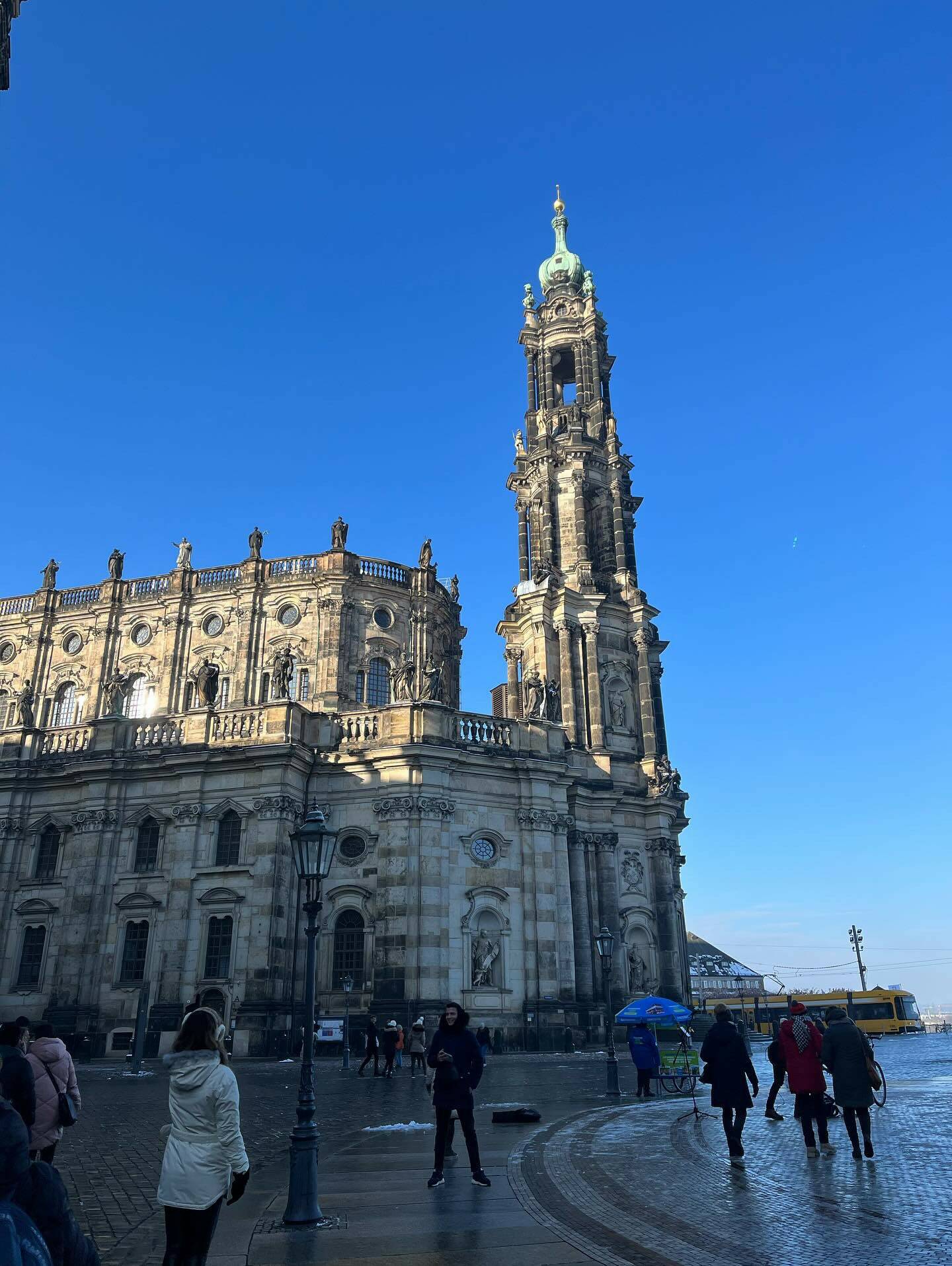 Procházka pokračovala k Fürstenzug, největšímu porcelánovému obrazu na světě, zachycujícímu historii Saska od 12. století do 19. století. Následně jsme si užili pohledy na Semperoper, slavnou operní budovu v neorenesančním stylu, pojmenovanou po významném německém architektovi Gottfriedu Semperovi. Poté jsme prošli krásný barokní komplex Zwinger a na chvíli jsme spočinuli v kostele Hofkirche.