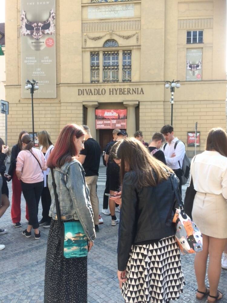Žáci následně zavítali do Divadla Na zábradlí, kde měli možnost zhlédnout divadelní novinku, adaptaci posledního Tolstého románu Vzkříšení, který zachycuje společenskou atmosféru carského Ruska na konci 19. století.