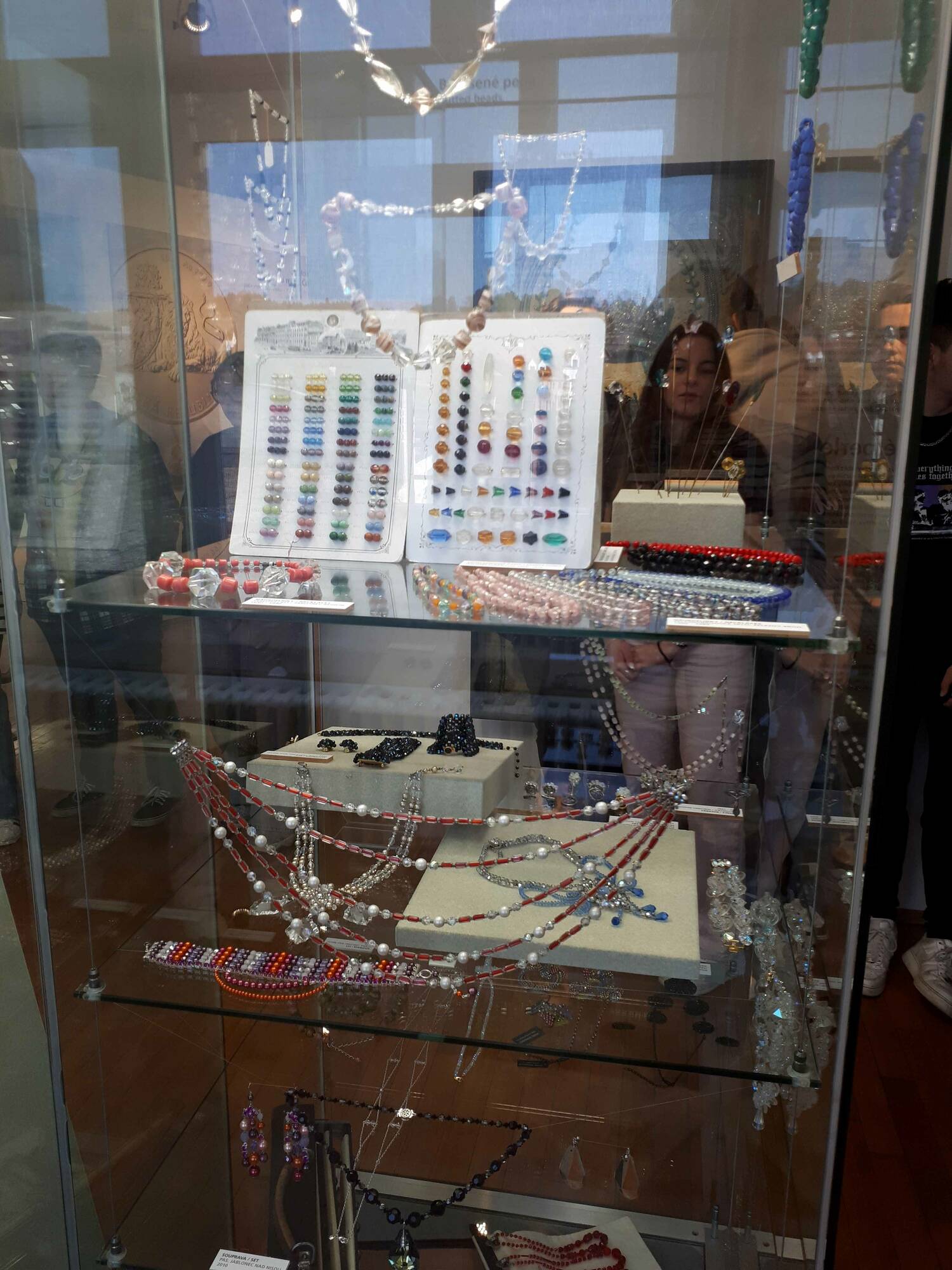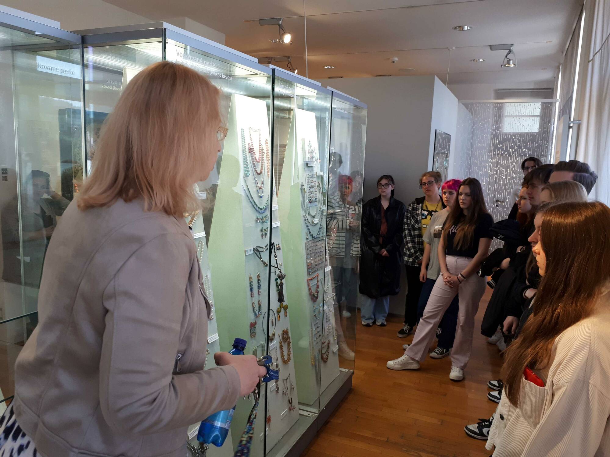 Paní průvodkyně začala nejprve historií – jak samotné budovy Muzea, města Jablonce jakožto obchodního centra, tak oboru bižuterie a sklářství v této oblasti. Poté seznámila pozorné studenty se sortimentem bižuterie, s charakterem vývozu, se specifiky, které export a obchod s různými artikly provází. Studenti se tak například dozvěděli, které indiánské kmeny používají korálky z Jablonce, která barva korálků je vůbec ta nejoblíbenější a nejžádanější, v čem je jablonecká bižuterie výjimečná, kdo jiný na světě se ještě výrobě korálků věnuje nebo z jakých materiálů lze bižuterii také vyrábět. Zvláštní sekce výstavy se věnovala i ražbě mincí a medailí. Cestou do dalšího patra – věnovanému sklu – mohli studenti obdivovat i nejdelší korálový náhrdelník na světě. Na samotný závěr exkurze pak paní kurátorka zavedla žáky do nové přístavby, kde se nachází výstava výběru vánočních ozdob. Velký úspěch u studentů měly zejména ozdoby navržené pro síť rychlého občerstvení McDonald´s ve tvaru hranolků či hamburgerů.