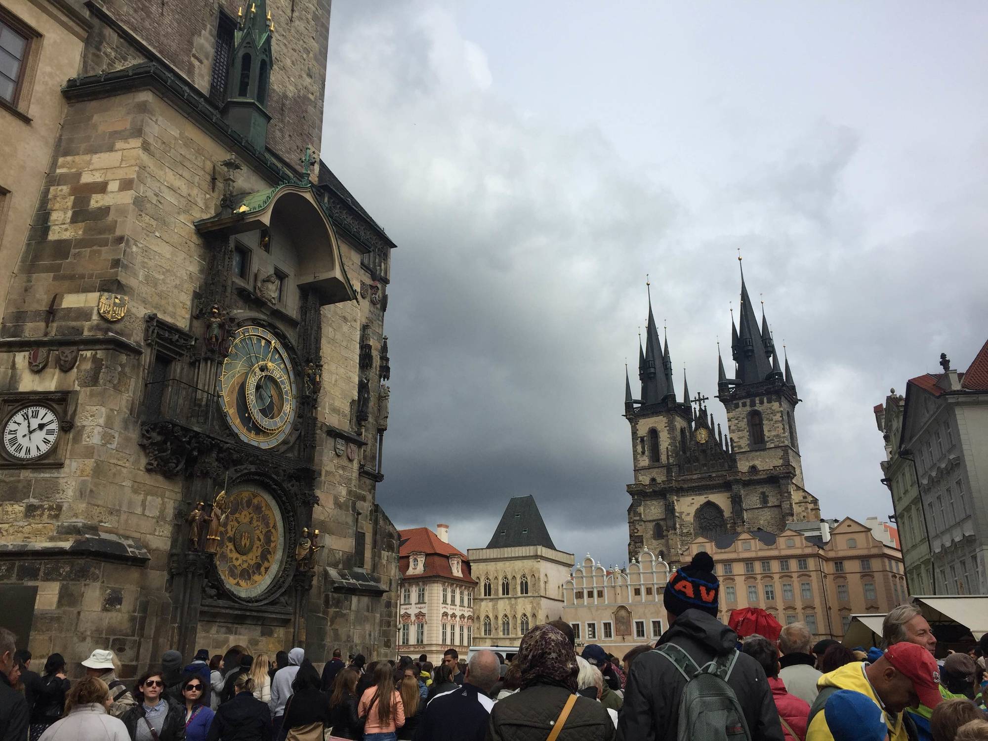 Procházka po Karlově mostě nám přinesla pohled na unikátní alej soch. Prošli jsme Staroměstskou branou na Křížovnické náměstí s barokními chrámy a Klementinem, Karlovou ulicí a přes Malé náměstí na Staroměstské náměstí. Právě odbíjel gotický orloj, aby nás upozornil na konec naší cesty pozpátku.