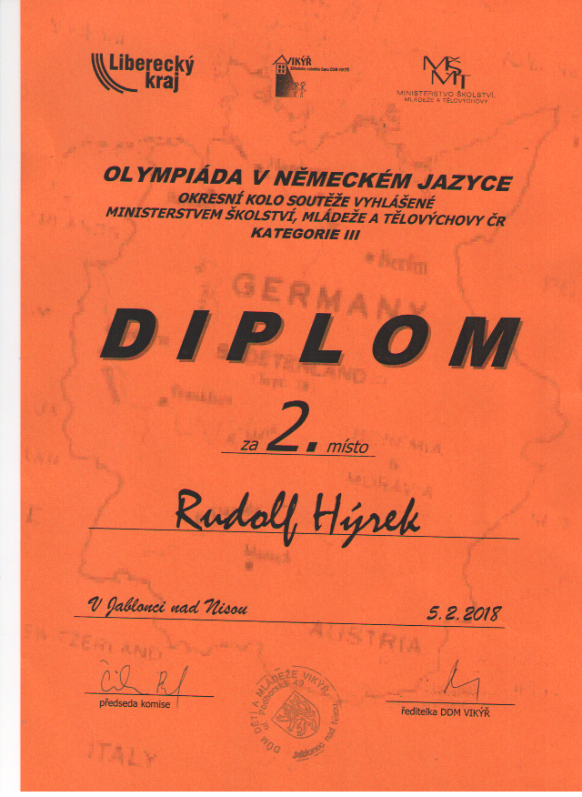 V pondělí 5.2.2018 se v Domě dětí a mládeže Vikýř v Jablonci nad Nisou uskutečnilo okresní kolo olympiády v německém jazyce. Naši školu reprezentovali 3 žáci z 2. a 3.ročníku, kteří postoupili ze školního kola: Rudolf Hýrek (O3.B), Daniel Rozkovec (O3.B) a Anna Požická (O2.B). Ve velké konkurenci žáků z jabloneckých gymnázií se naší škole podařilo dosáhnout skvělého úspěchu, hlavně díky perfektnímu výkonu Rudy Hýrka, který získal krásné 2.místo a postupuje tak do krajského kola, které se bude konat v březnu v Liberci. Chtěla bych vyzdvihnout také výkon Dana Rozkovce a Aničky Požické, kteří se drželi velmi statečně a obsadili 6. a 7.místo.