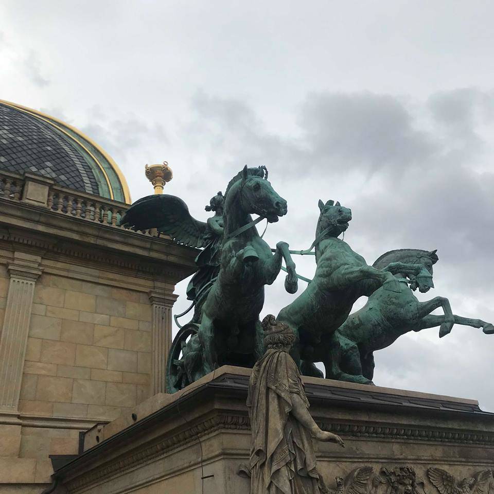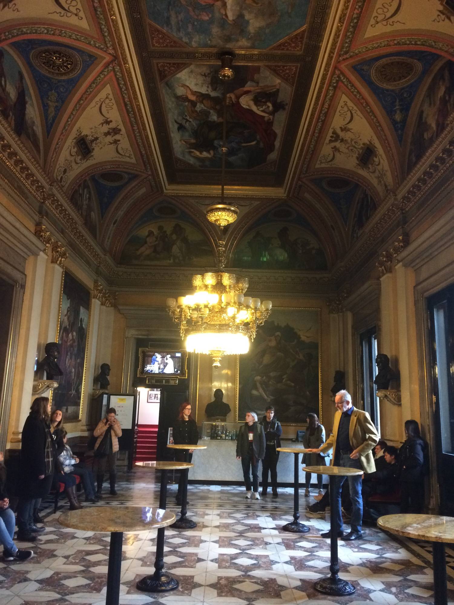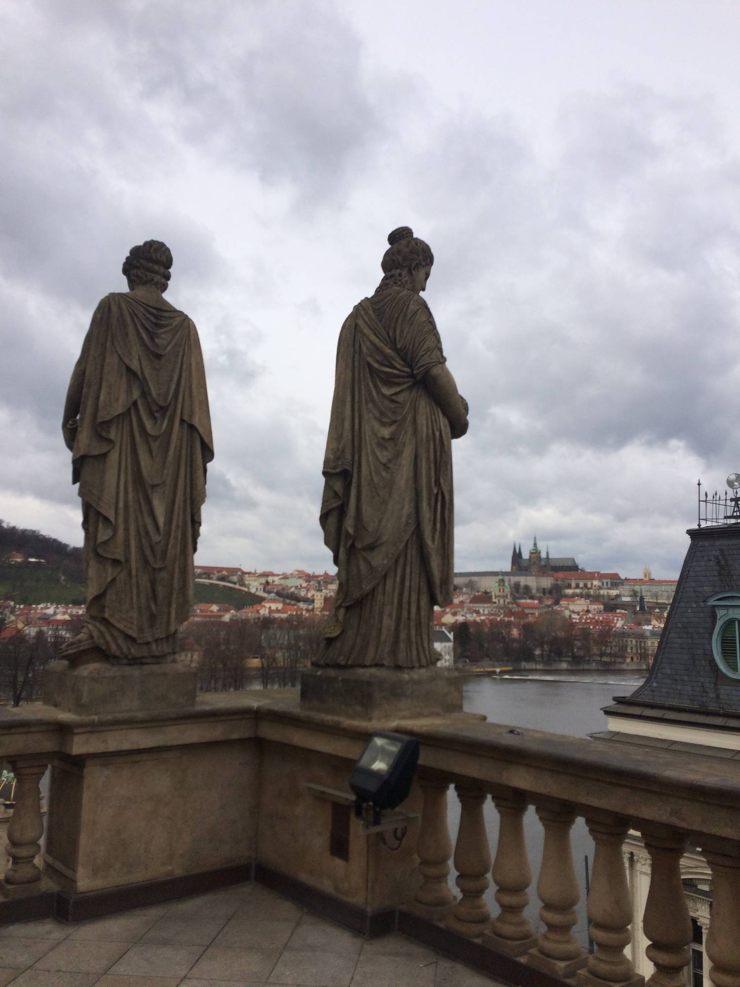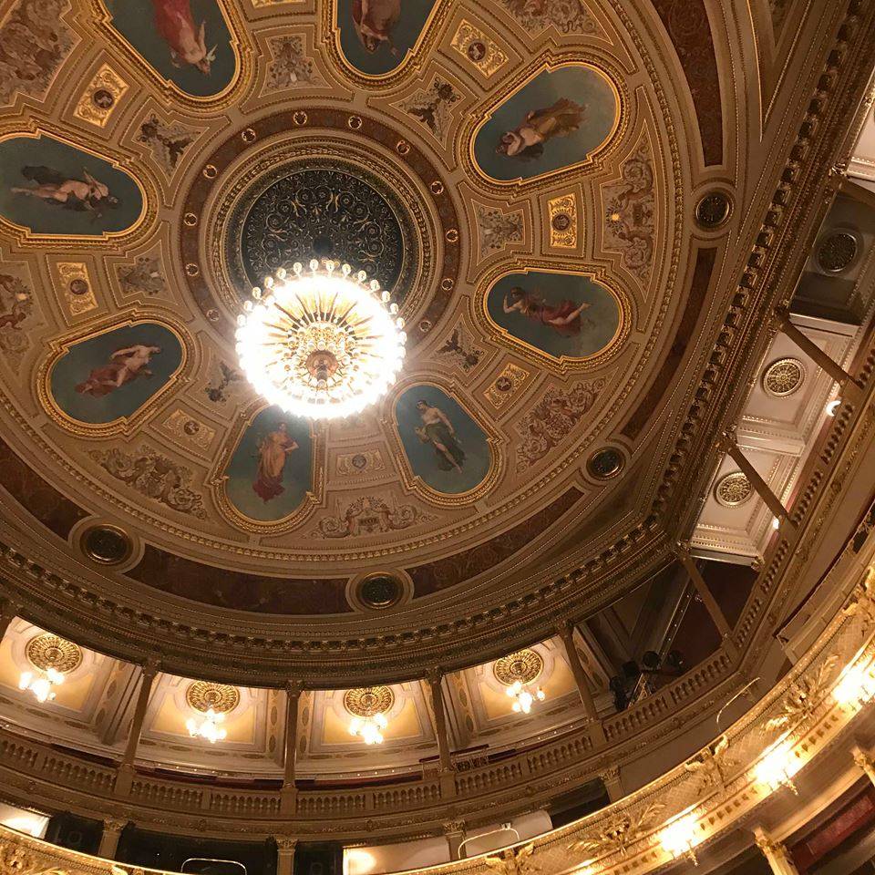 Tentokrát jsme dopoledne pátrali po místech, kde stálo první německé stálé divadlo V Kotcích, české divadlo Bouda, seznámili se s historií Stavovského divadla, zjistili, kde je Divadlo Hybernia nebo Broadway. Sami jsme si jako „cesťáček“ procházku po pražských divadlech průvodcovali. Ještě před polednem nás čekala prohlídka Národního divadla. Měli jsme štěstí na skvělého průvodce. Jeho výklad byl zajímavý a velmi poučný. V divadle jsme měli možnost si prohlédnout slavnou Hynaisovu oponu. Užili jsme si i nádherný a fotogenický výhled na Pražský hrad ze střechy divadla. Po prohlídce jsme poseděli ve známé kavárně Slavia.