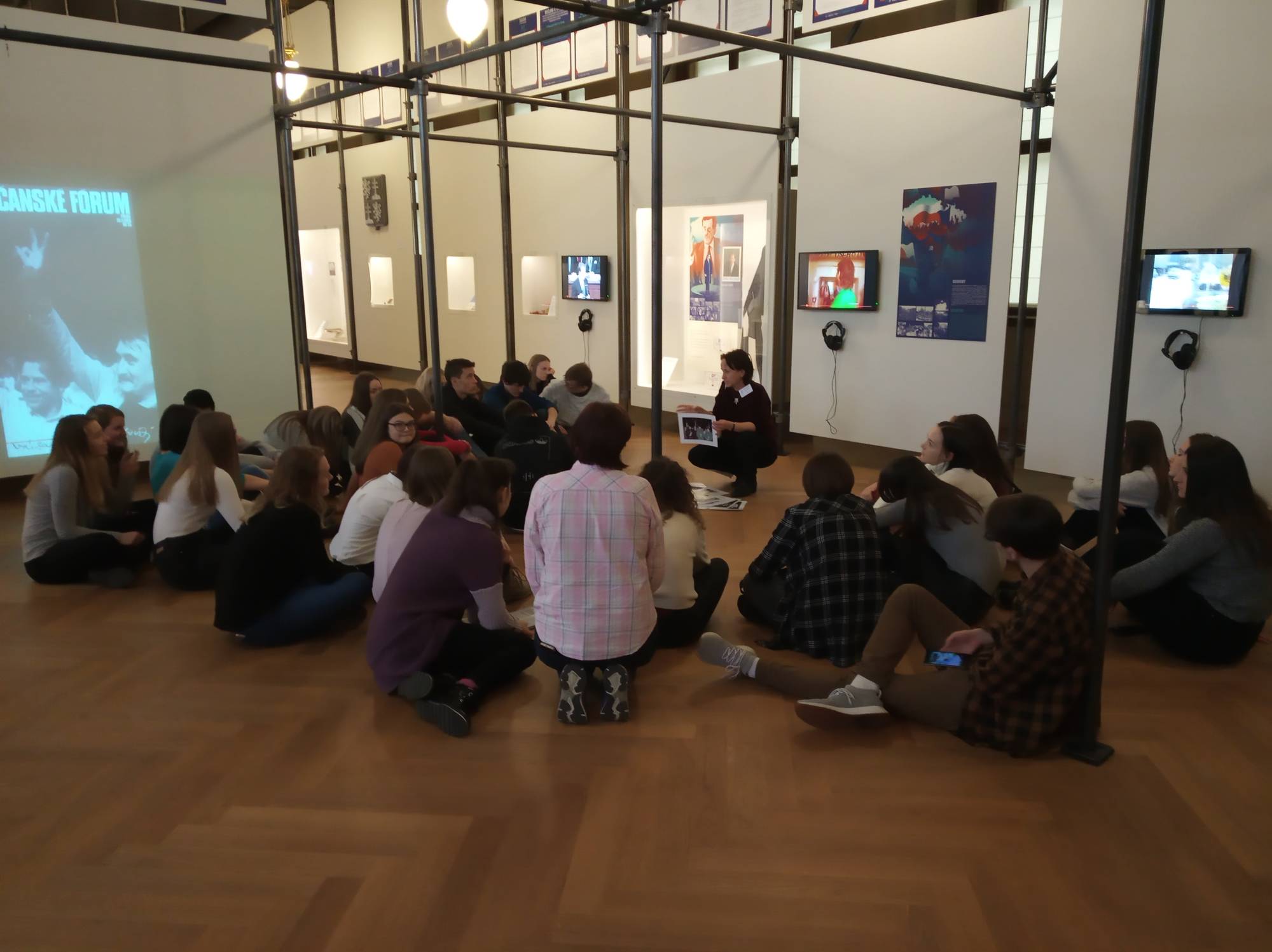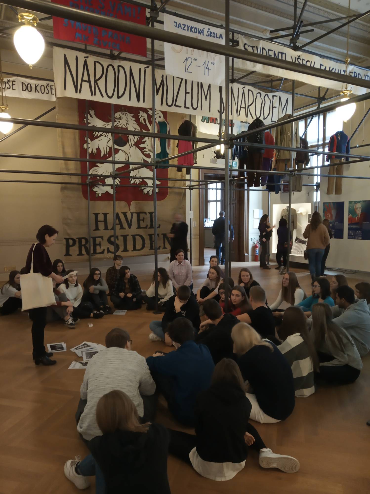 V jednu hodinu jsme vcházeli do Národního muzea. Zde nás čekala poutavá výstava Sametová revoluce. Průvodkyně nás seznámila nejen s událostmi 17. listopadu roku 1989, ale i s dobou samotnou. Vyložila nám, co vše předcházelo tomuto významnému dni a také, co následovalo. Sami jsme si sestavili časovou osu klíčových revolučních událostí a pomocí pracovních listů si odpověděli na otázky, které nám přiblížily dobu z pohledu práv občanů, kultury, ale i ekologie.