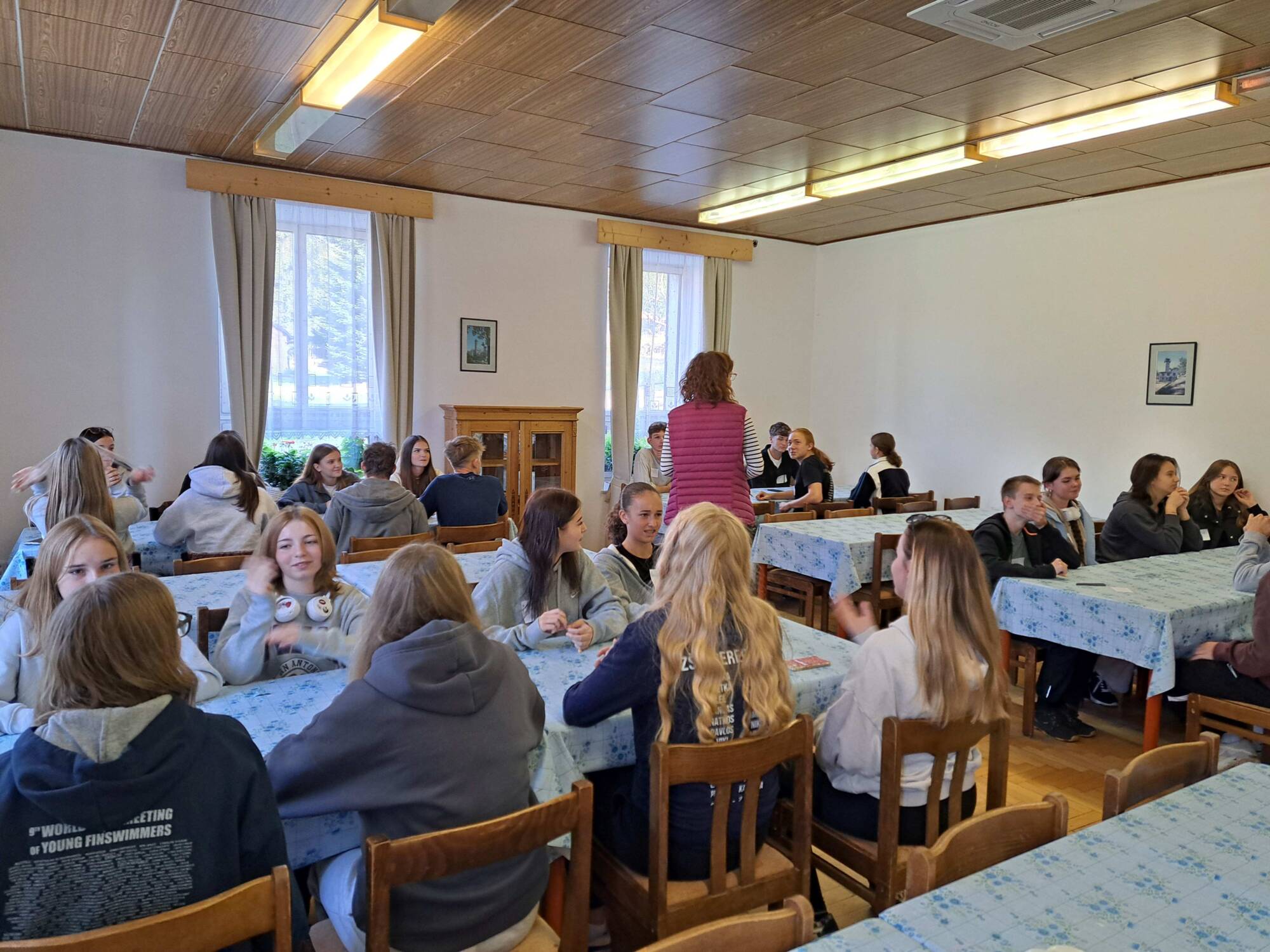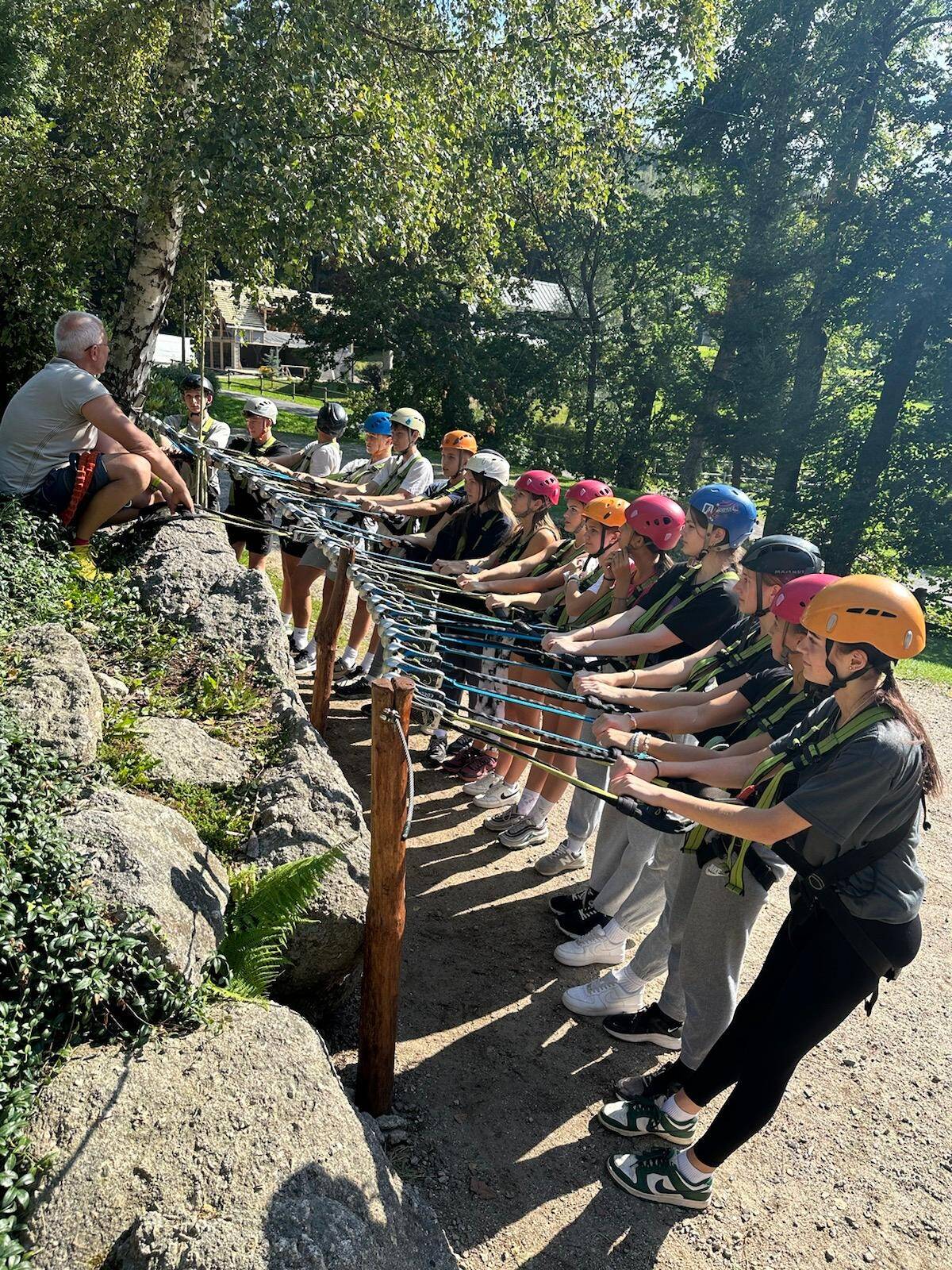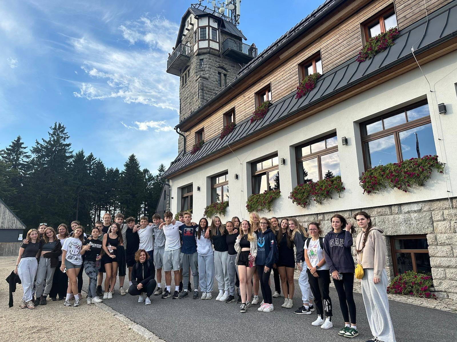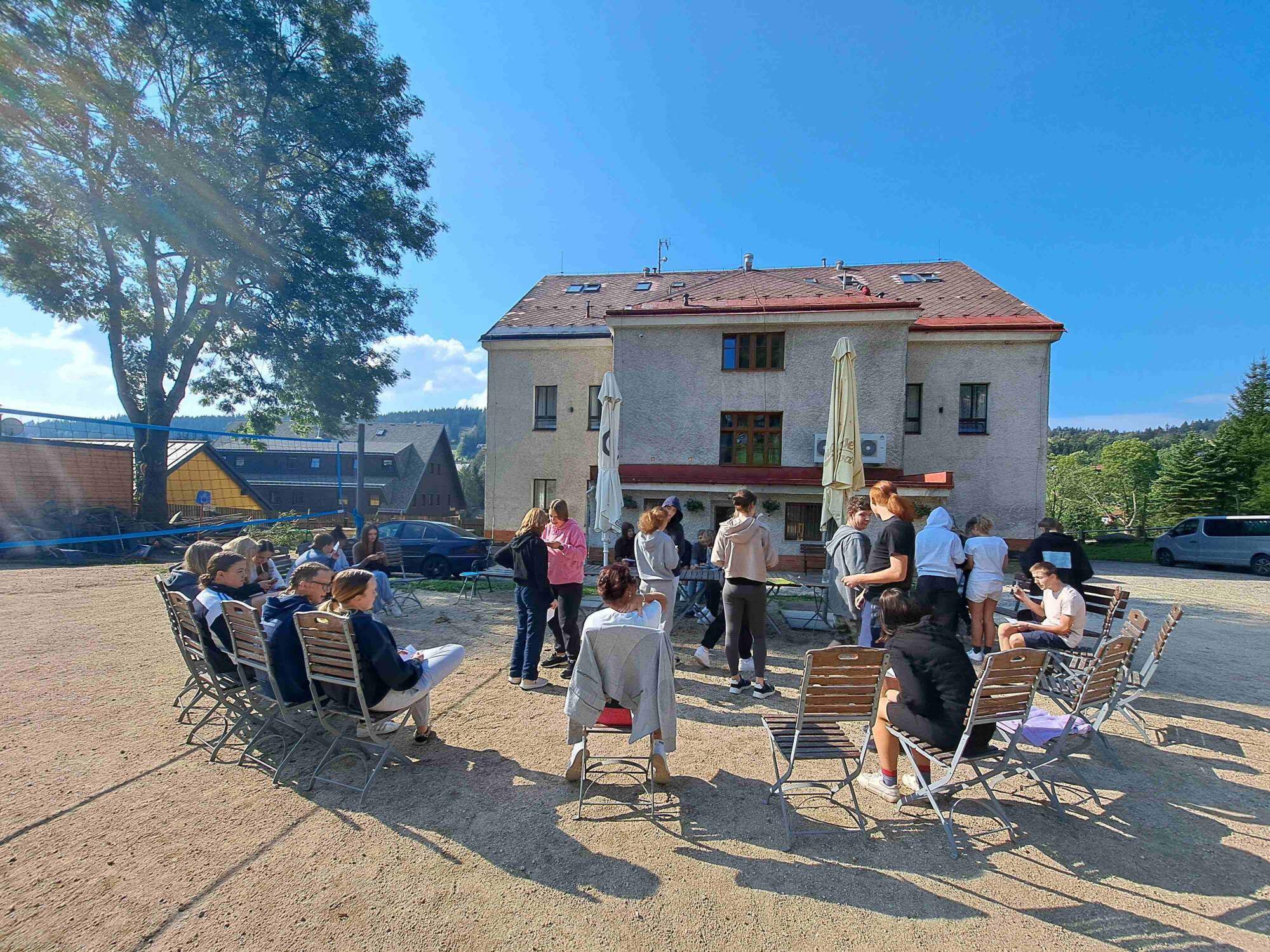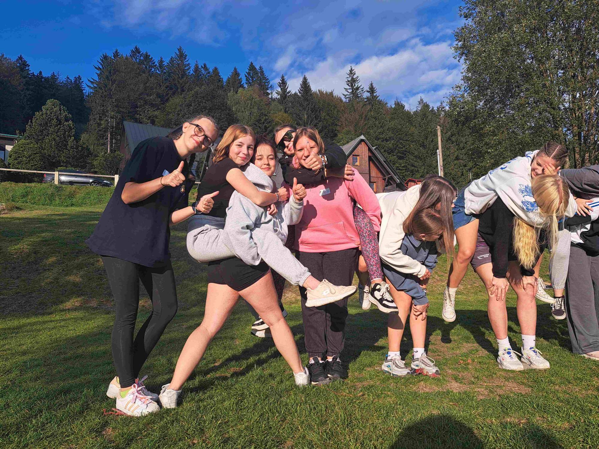 Náš seznamovací kurz začal tím, že půlka třídy jela autobusem a druhá půlka se dopravila do Bedřichova samostatně. Naše první aktivita byl speedating. Potom jsme si určili pravidla chování pro naši třídu a hráli jsme hry s míčem, abychom se naučili naše jména. Následoval obídek (rizoto a polévka). Odpoledne jsme se vydali do lanového centra a tam jsme strávili dvě hodiny lezením. Po lanovém centru nás čekala neočekávaná cesta na Královku. Na Královce jsme se osvěžili a šli jsme zpátky na chatu. Pak jsme měli večeři (bramborové špalky, vepřové a špenát). Večer jsme strávili u ohně a byli jsme rozděleni do týmů, které připravovaly divadlo na následující večer. Na závěr jsme měli do večerky volno.