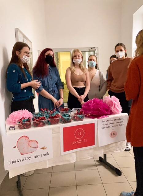 Prodej hotových náramků proběhl ve čtvrtek 10. 2. ráno a v pátek 11. 2. o velké přestávce. Nabízeli jsme utahovací stužkové náramky ve dvou barevných provedeních s vícejazyčným tematickým potiskem v angličtině, češtině, francouzštině a španělštině, oceněné symbolickou částkou 5 Kč. Výdělek využijeme příští rok na přípravu maturitního plesu.