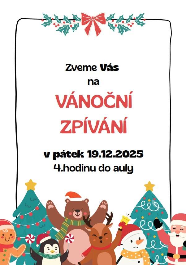 Srdečně vás zveme na tradiční předvánoční setkání, které uzavře první polovinu školního roku v té nejlepší atmosféře – Vánoční zpívání 2025!